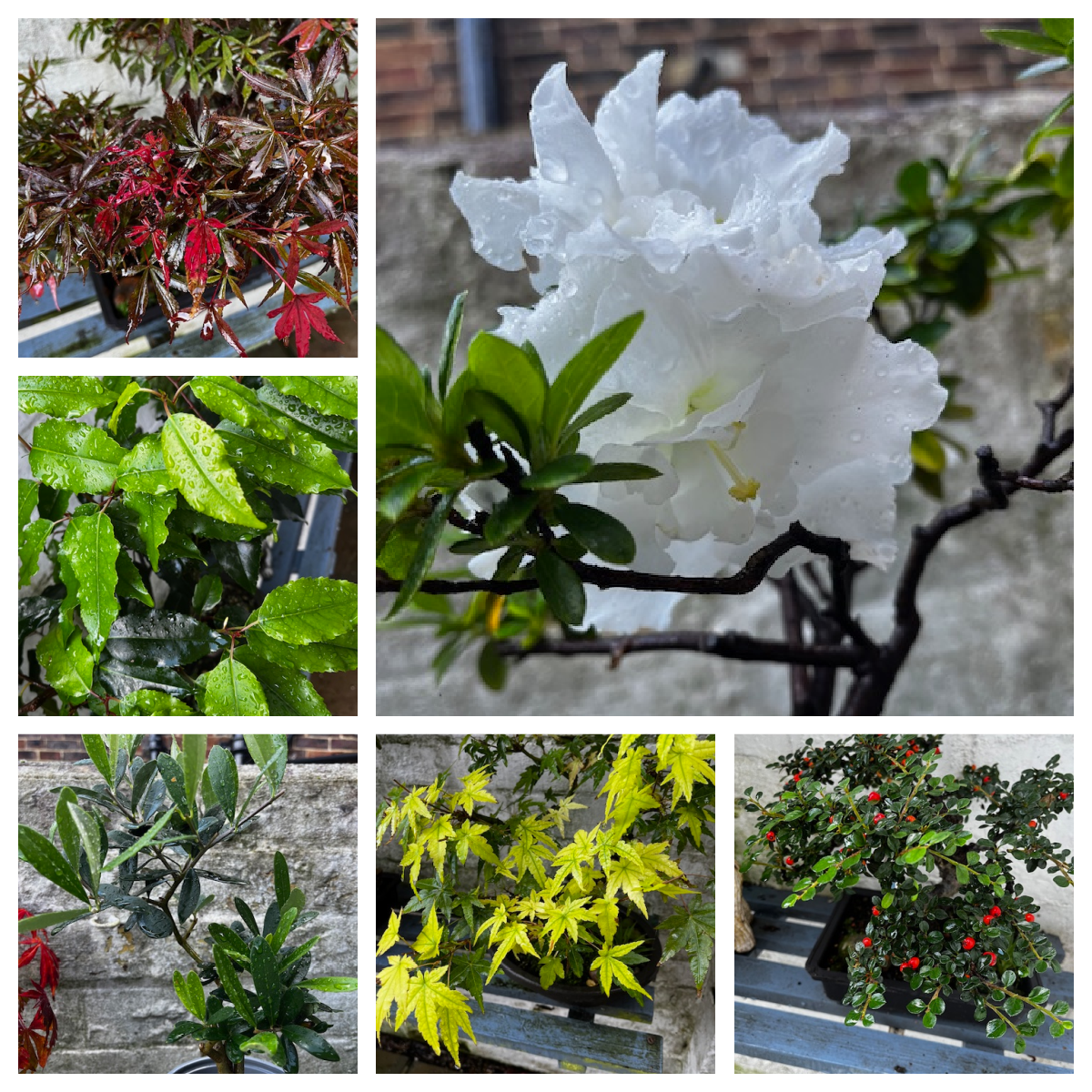 Top of the list is my long-suffering double azalea. Earlier this year, it didn’t look happy, so I had a peek at the roots only to find it didn’t seem to have any. Either the foul weather we had back then had rotted them, or something had eaten them. I have had this bonsai for a long time now and it has never thrived, but still insisted on flowering every Christmas. I just wish it would grow a bit and look a lot healthier. This latest setback should have carried it off, but with fresh compost and a sheltered position, it is looking better than it has in ages. Those flowers are doubles and far too heavy for the spindly branch that carries them, but the leaves are greener and more plentiful.